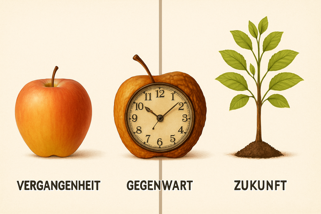 Und genau in diesem Jetzt liegt unsere Kraft. Es ist der einzige Zeitpunkt, an dem wir handeln, entscheiden, gestalten können. Der Apfel hatte keine Wahl – er konnte die Veränderung nicht aufhalten. Aber wir Menschen haben die Fähigkeit, bewusst zu werden, innezuhalten, zu erkennen. Wir können „nur“ die Gegenwart gestalten – durch unsere Haltung, unsere Worte, unsere Taten. Und so prägen wir das, was wir zwar jetzt Zukunft nennen, doch später unsere Gegenwart sein wird.